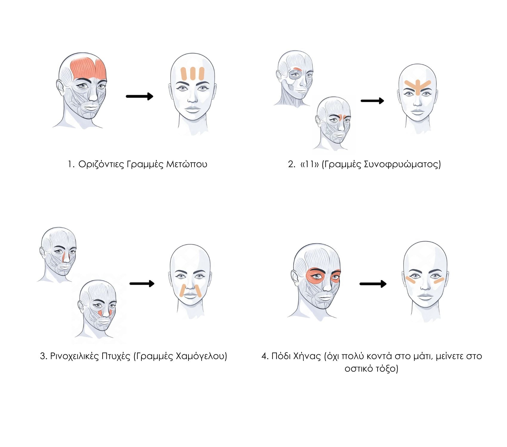 Μέτωπο, «11», γύρω από τα μάτια, παρειές, jawline, λαιμός.