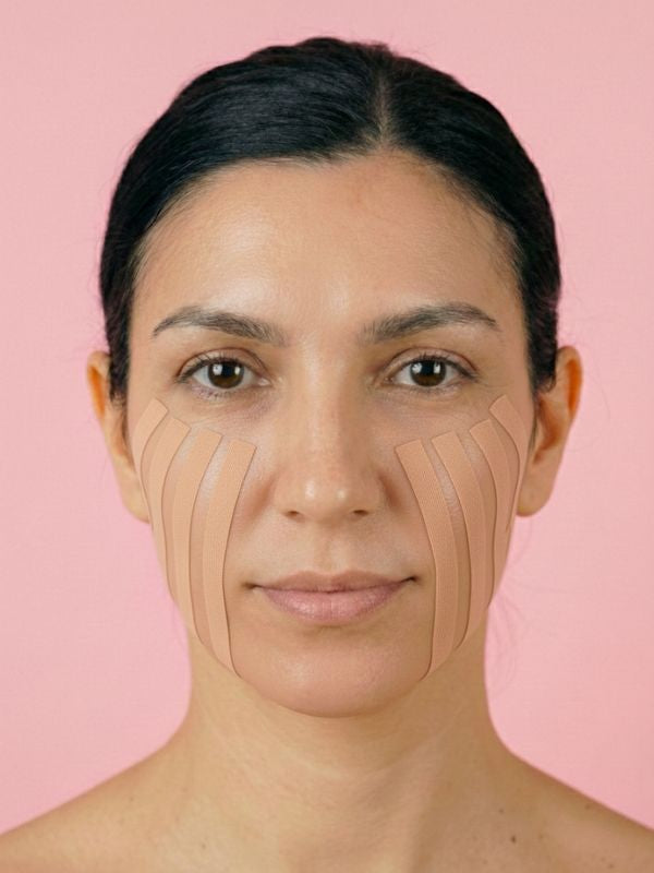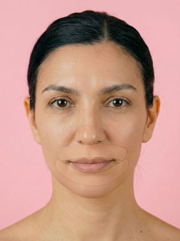 💡 Tip: Σήκωσε το δέρμα και κόλλησε στενές καμπύλες λωρίδες από τη γωνία του στόματος → γνάθο, χωρίς τέντωμα· κράτα 1–2 mm απόσταση από το περίγραμμα, στρογγύλεψε άκρες και βγάλε αργά με στήριξη.