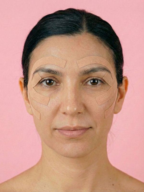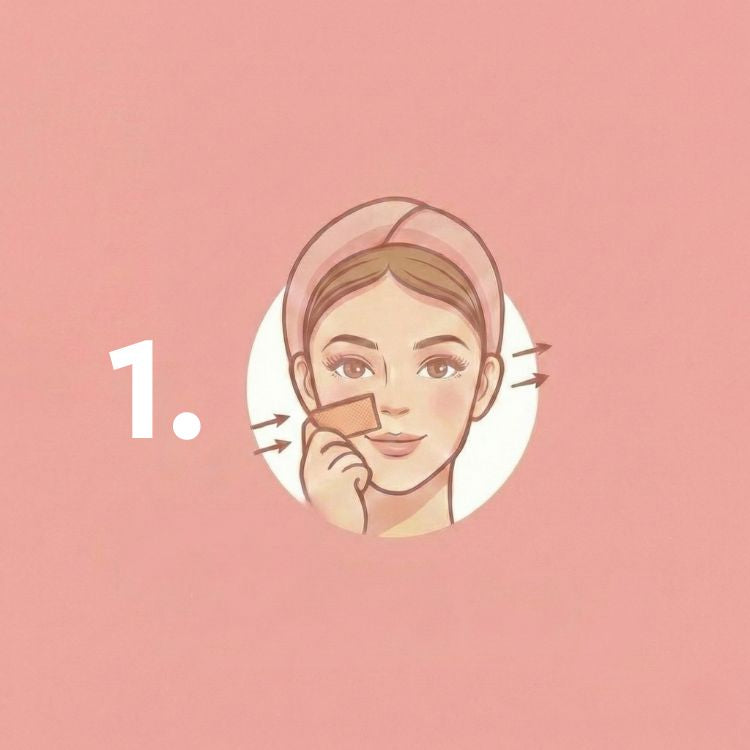 3–4 λεπτές λωρίδες ανά πλευρά, σε διάταξη βεντάλιας που «αγκαλιάζει» την εξωτερική γωνία του ματιού (όπως στην εικόνα), με κατεύθυνση: από το οστικό τόξο δίπλα στο μάτι προς τα έξω/πάνω στον κρόταφο (↗) και προς κάτω–έξω προς το ζυγωματικό (↘).